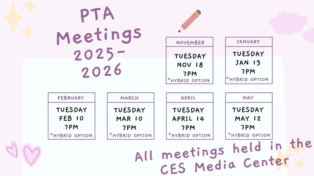 CES PTA is a nonprofit association that prides itself on being a powerful voice for all children, a relevant resource for families and communities, and a strong advocate for public education. Membership in PTA is open to anyone who wants to be involved and make a difference for the education, health, and welfare of children and youth.